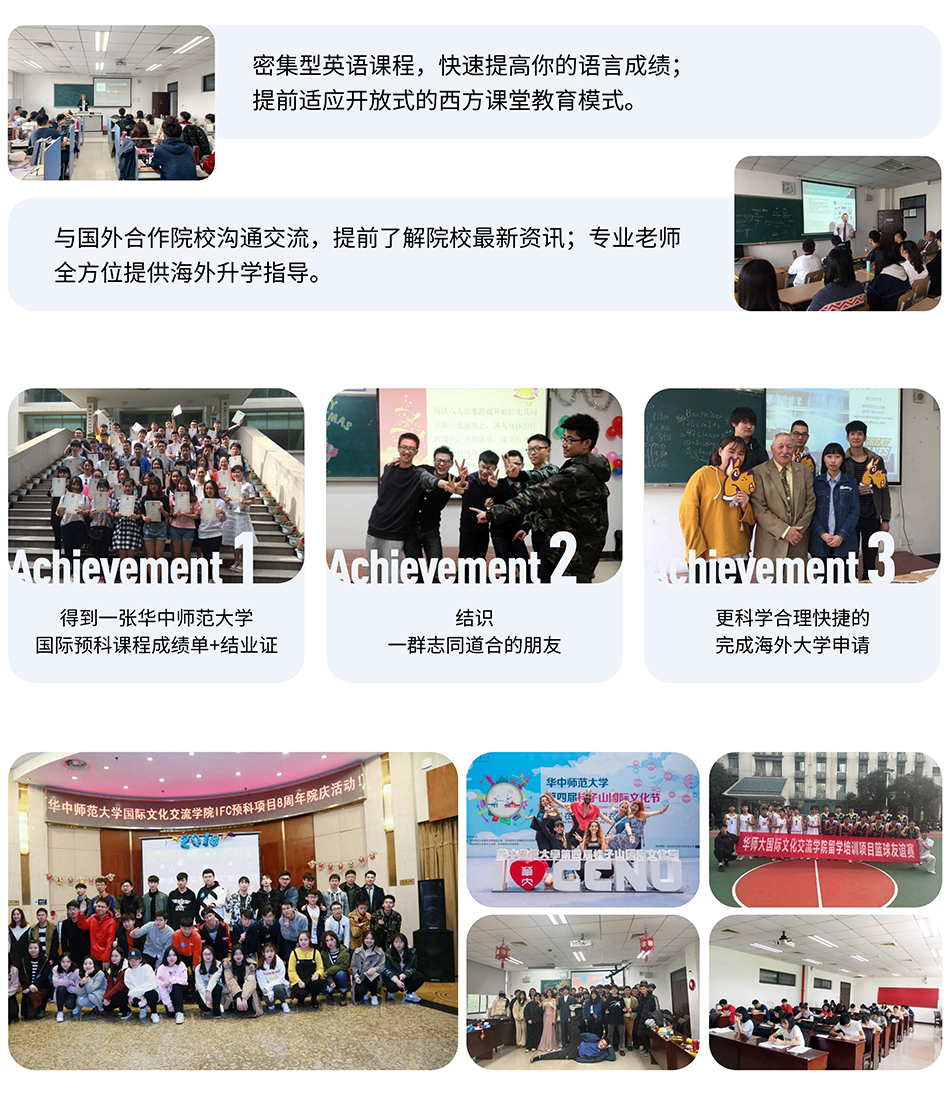 国际文化交流学院代表学校承接“华文教育基地“、“来华留学示范基地”、“中国政府奖学金来华留学预科基地”、“国家新汉语水平考试考点和湖北省汉语国际推广工作研究基地”相关教学与管理工作。负责来华留学生的招生录取、学籍管理、涉外管理以及日常教育管理和服务,先后培养了来自于173个国家的各类国际学生11000余名。国际文化交流学院IFC国际预科课程是通往英国、美国、澳大利亚、加拿大、新西兰、新加坡等国家,100余所世界一流大学教育的桥梁,课程体系是以构建赴海外名校留学的能力为基准,对学生进行全方位的培养。